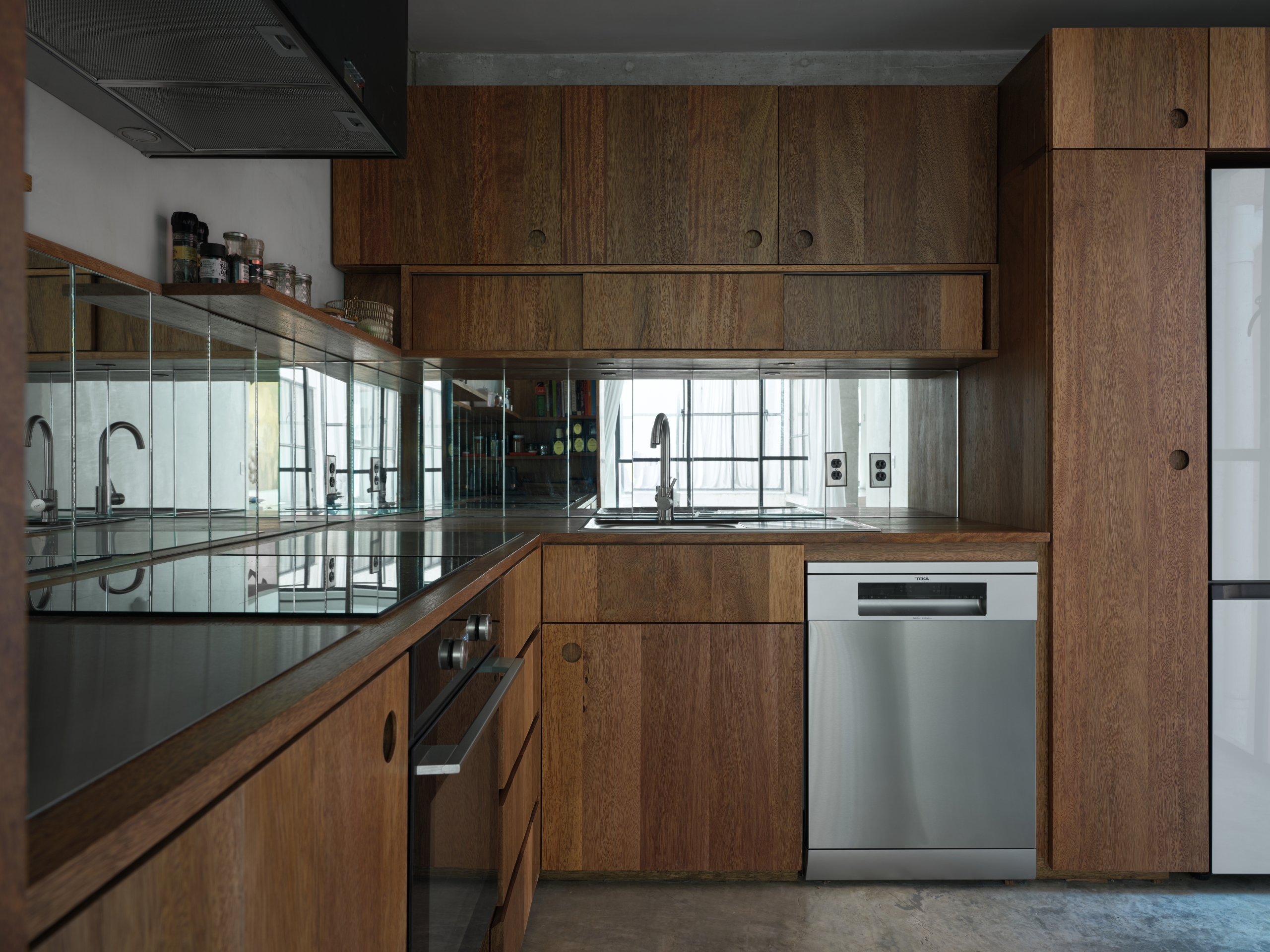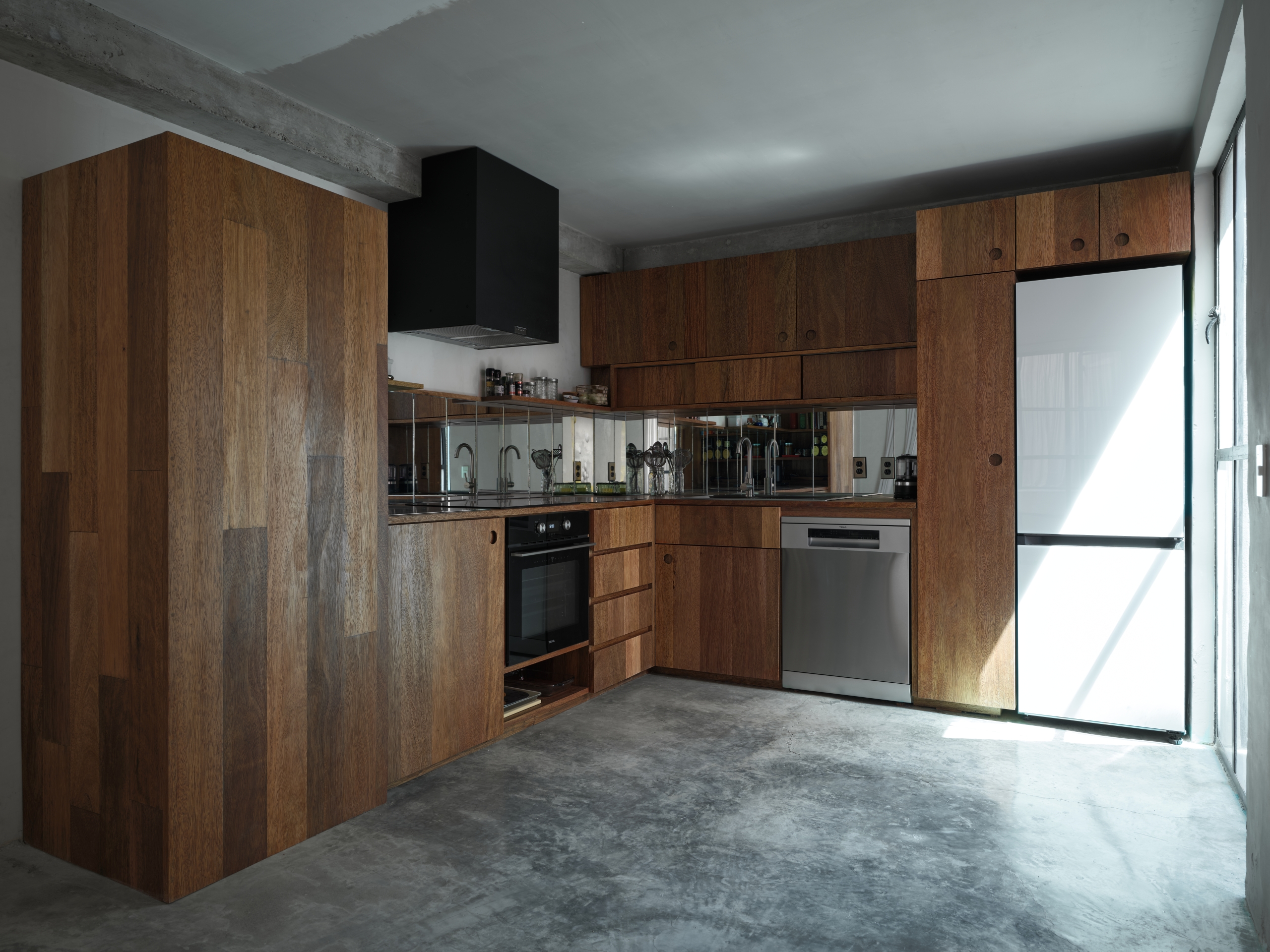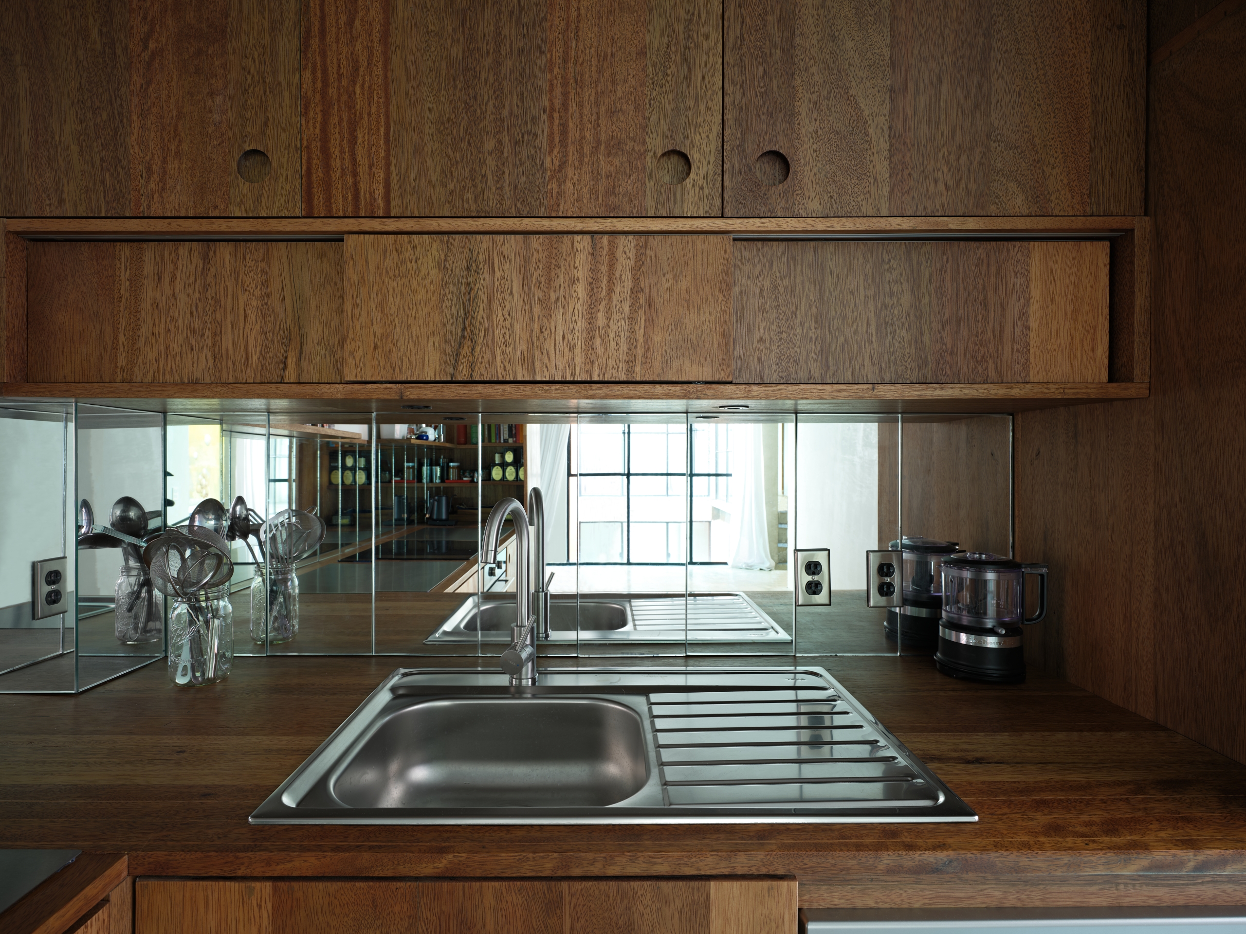 Integrated kitchen for an apartment. Made of solid tornillo wood, with mirrored backsplashes and Teka appliances. The kitchen design conceals and renders invisible essential parts of the apartment’s functionality. In one of the cabinets, for instance, we find the electrical control panel; that same cabinet and the corner shelf wrap around one of the columns, integrating it into the design and making it disappear. Likewise, to conceal the extractor, we opted for a simple yet striking range hood that, in harmony with the large proportion of shelving in the kitchen, provides extensive storage space for a relatively small kitchen.