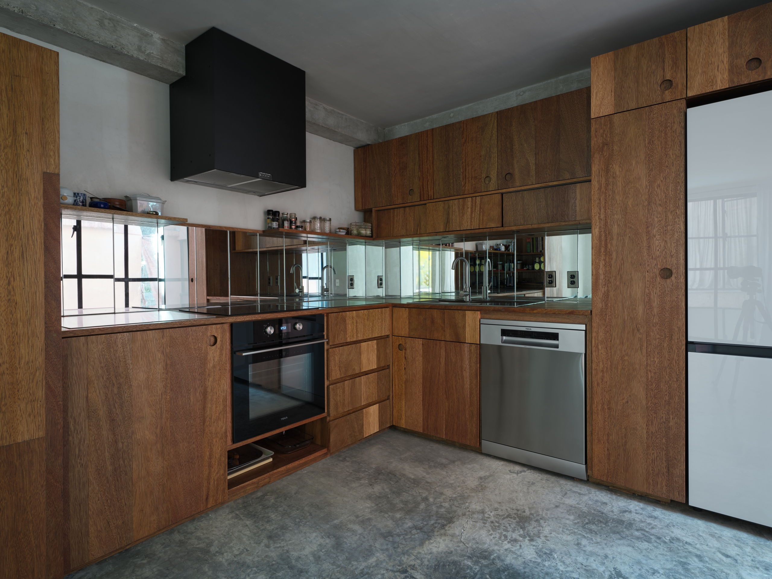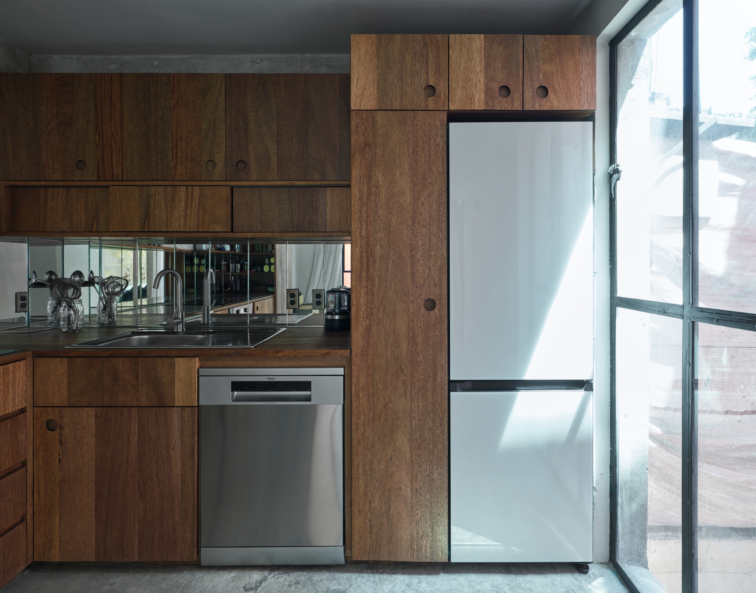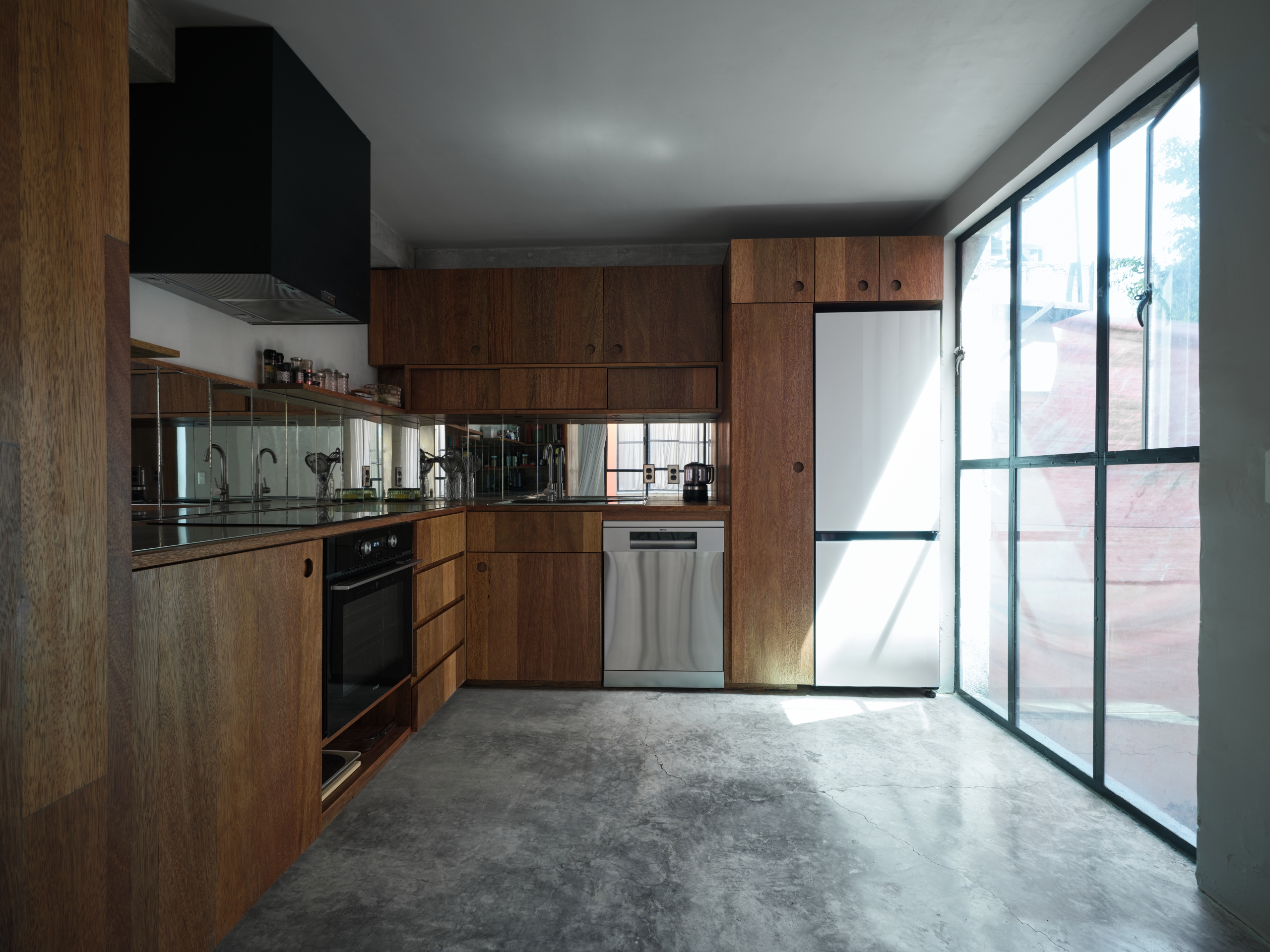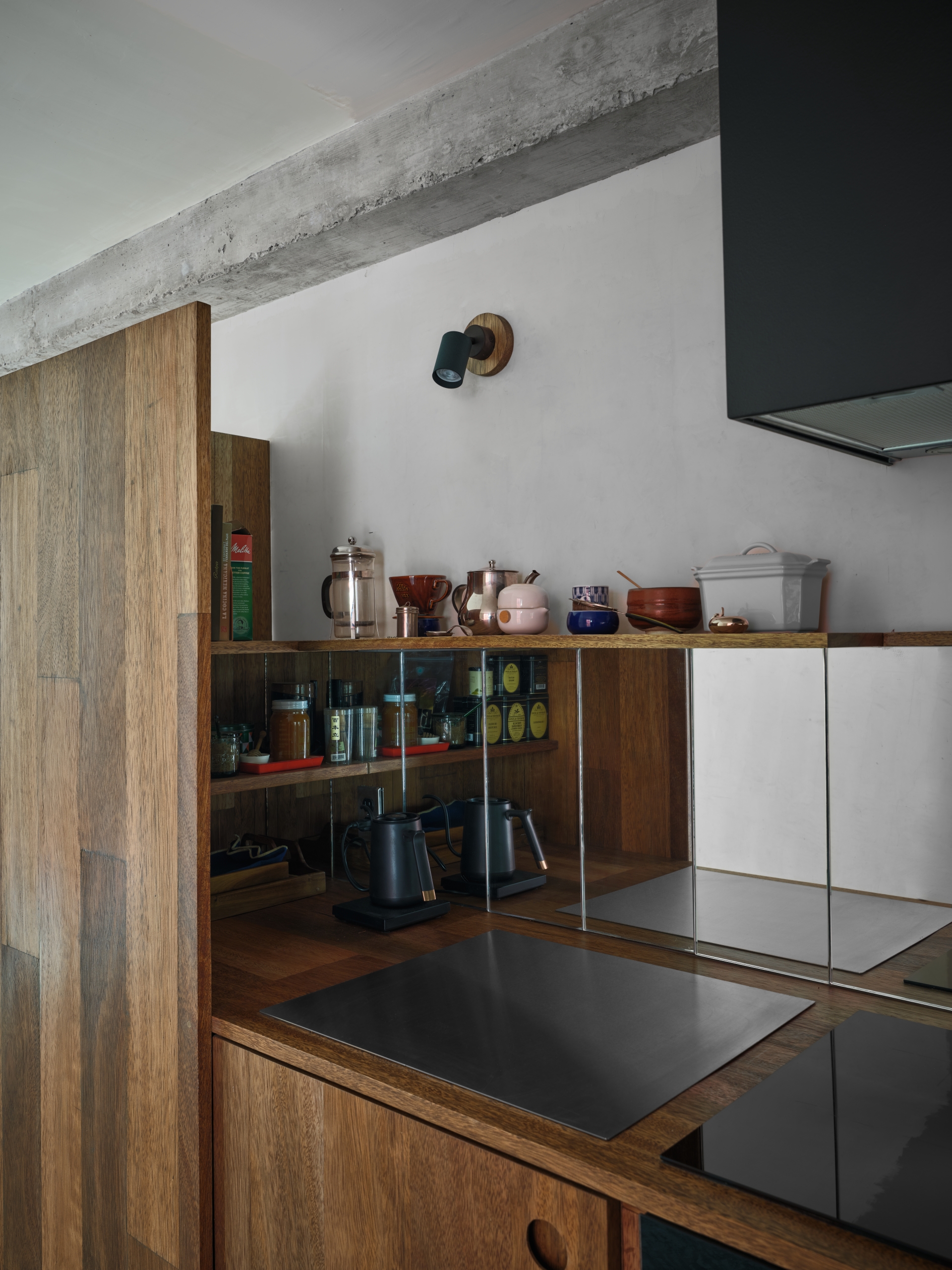 Integrated kitchen for an apartment. Made of solid tornillo wood, with mirrored backsplashes and Teka appliances. The kitchen design conceals and renders invisible essential parts of the apartment’s functionality. In one of the cabinets, for instance, we find the electrical control panel; that same cabinet and the corner shelf wrap around one of the columns, integrating it into the design and making it disappear. Likewise, to conceal the extractor, we opted for a simple yet striking range hood that, in harmony with the large proportion of shelving in the kitchen, provides extensive storage space for a relatively small kitchen.