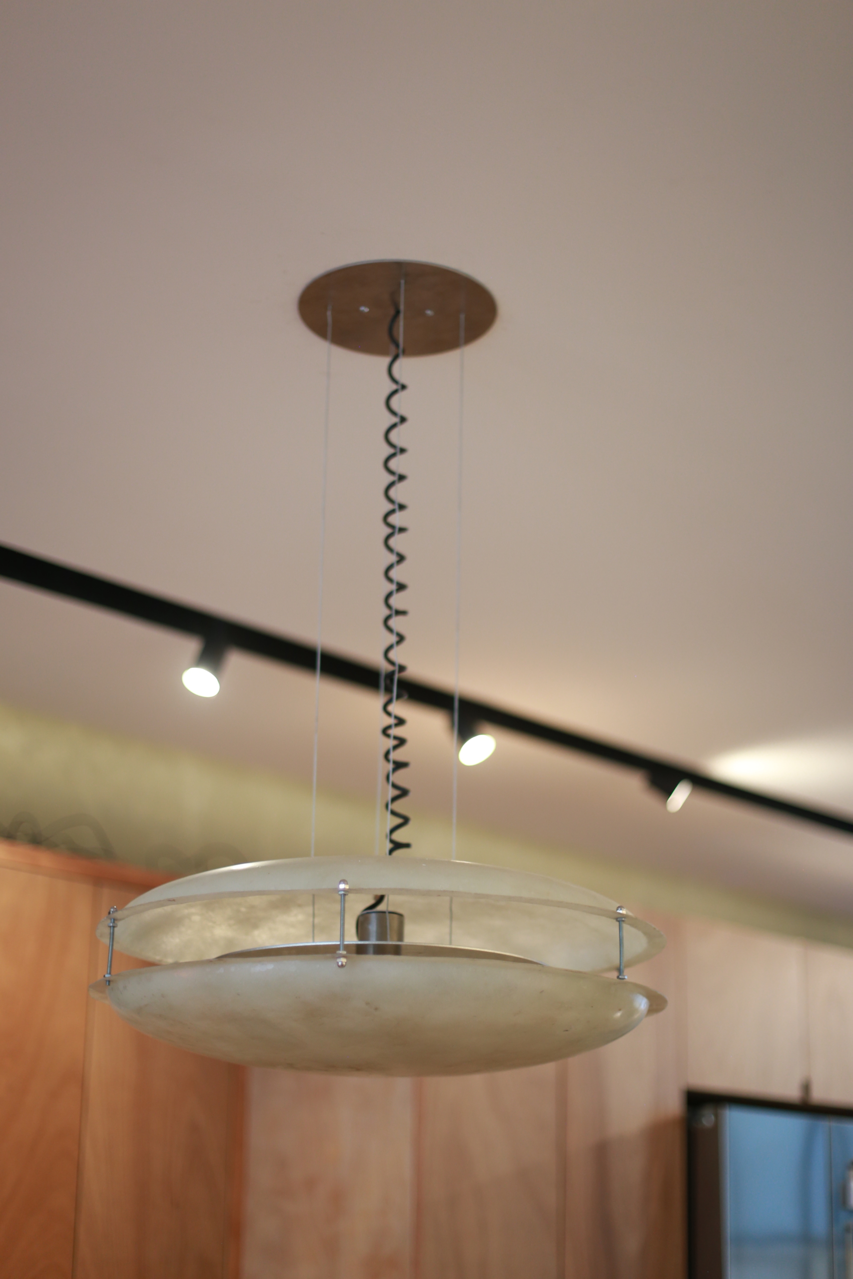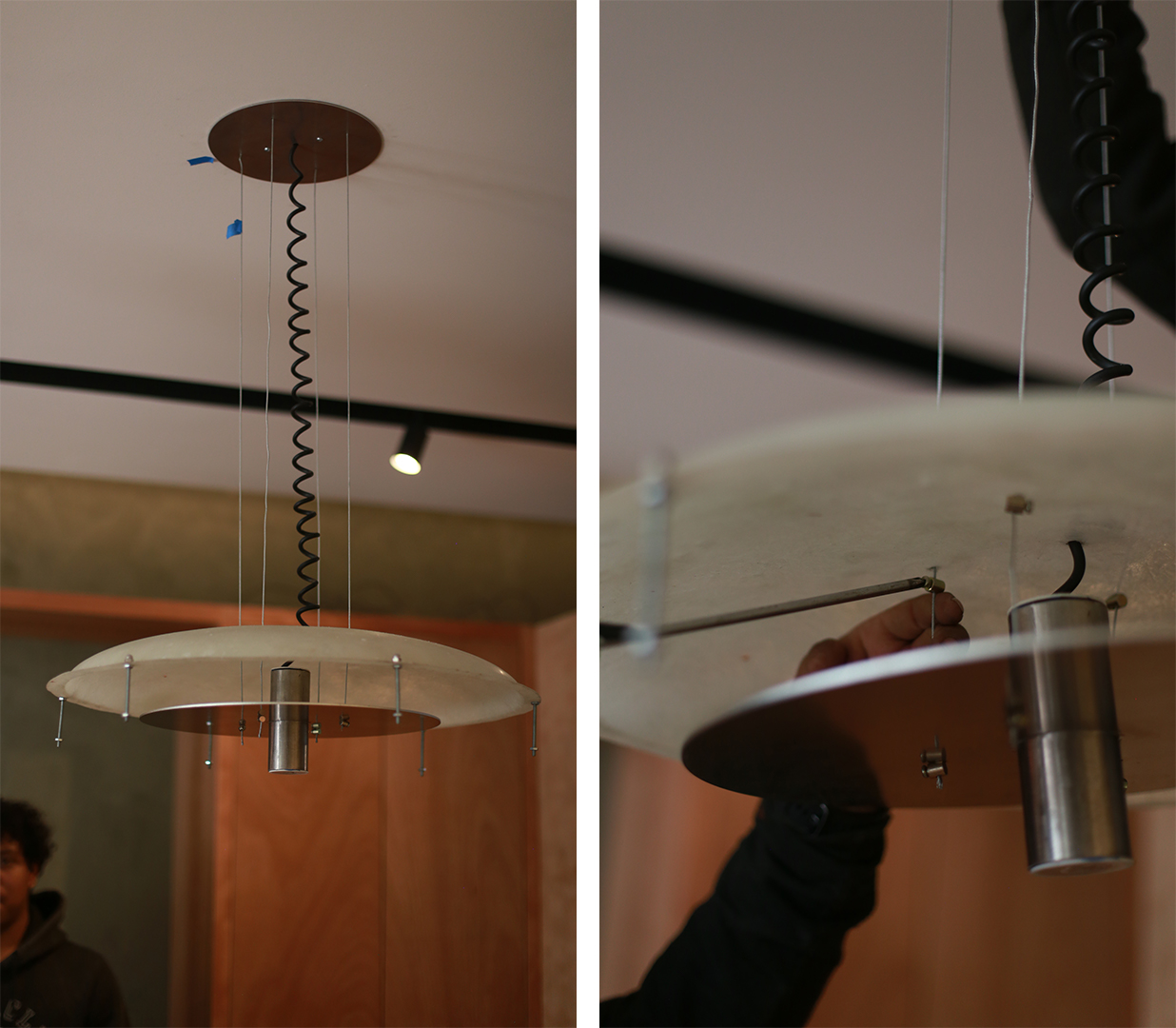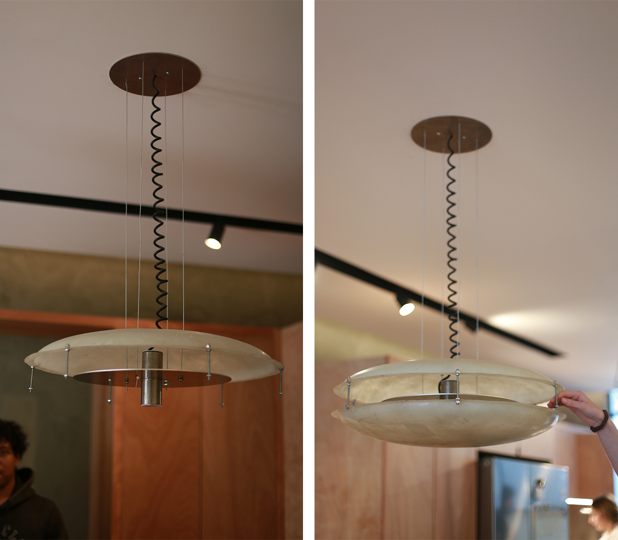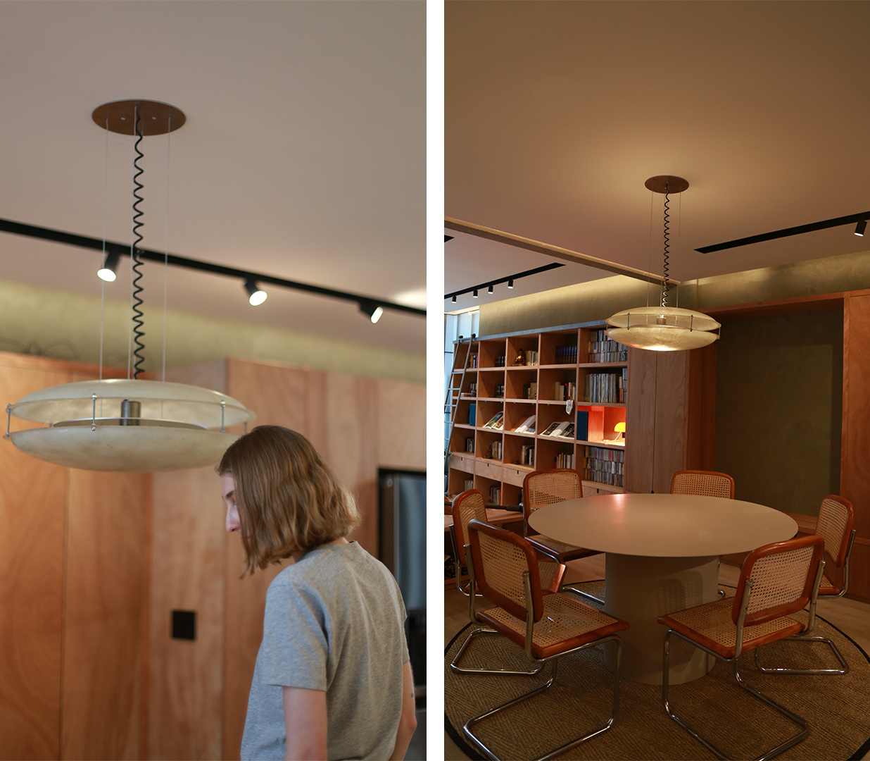 With the Veracruz lamp, Carlota Coppel, designer at Estudio Sardina, experiments with the translucency of fiberglass. The complexity of this lamp also lies in leveling each part precisely. Every component must be meticulously leveled to achieve the correct shape. Between the fiberglass plates, a smaller steel plate supports the lightbulb and reflects its light.