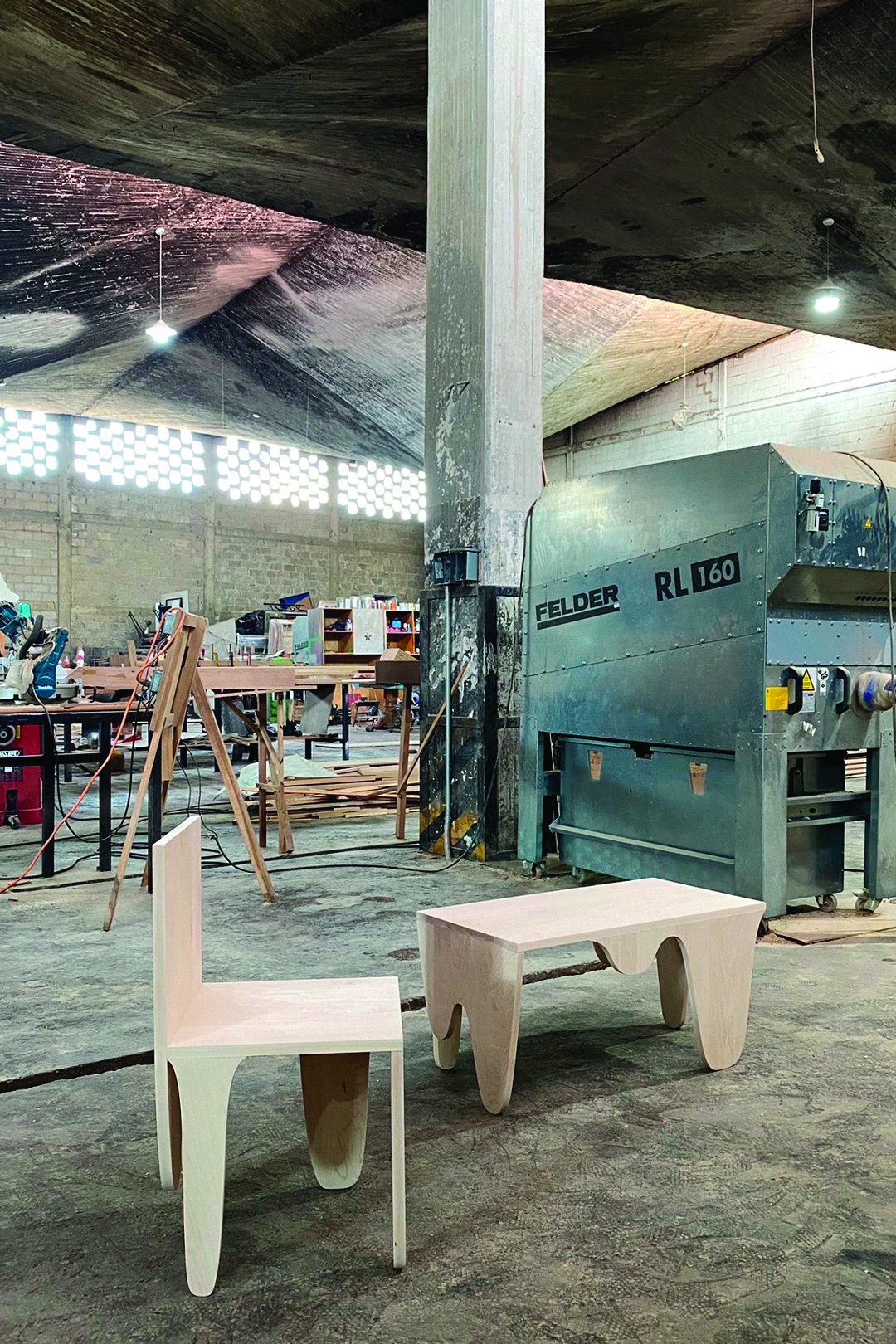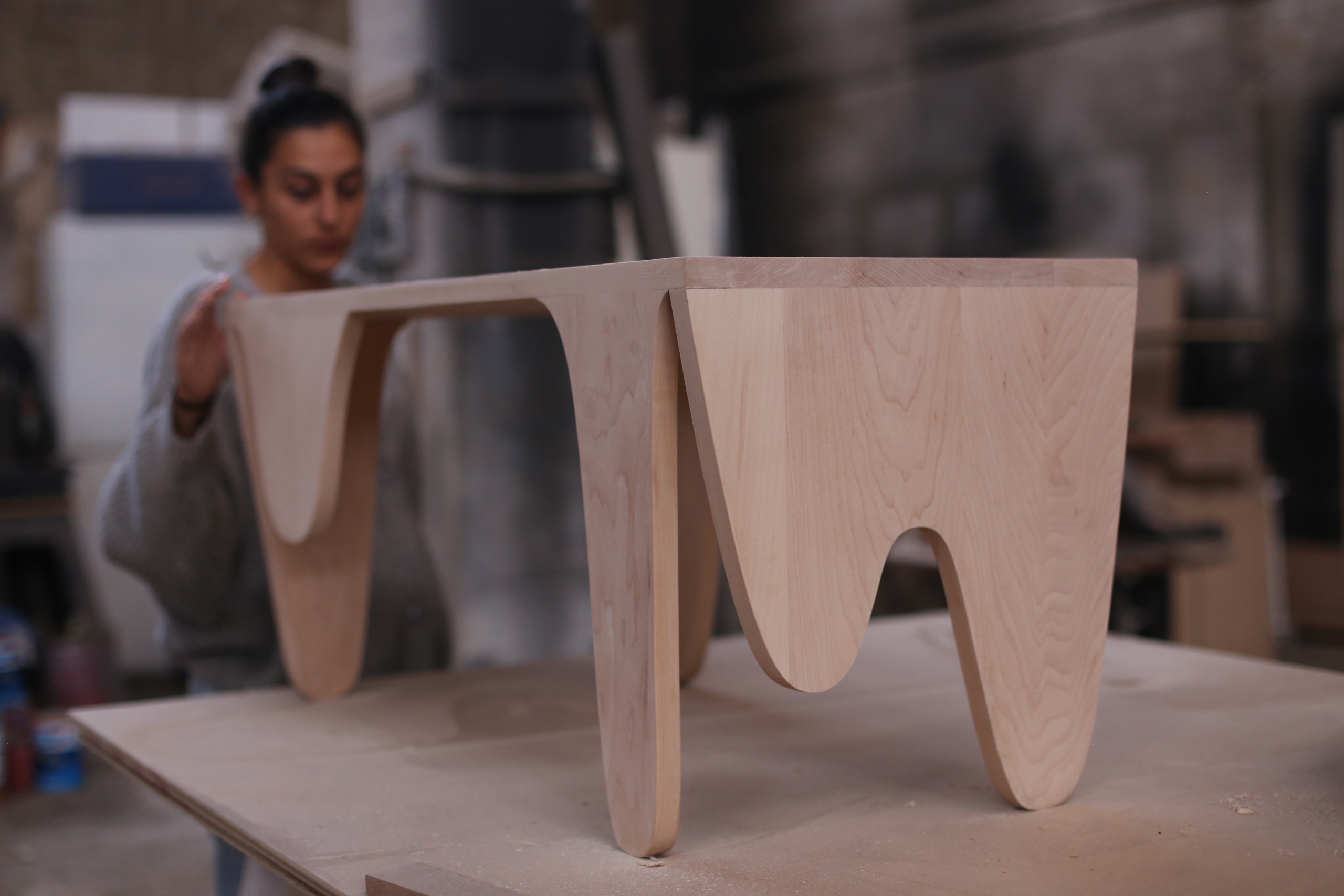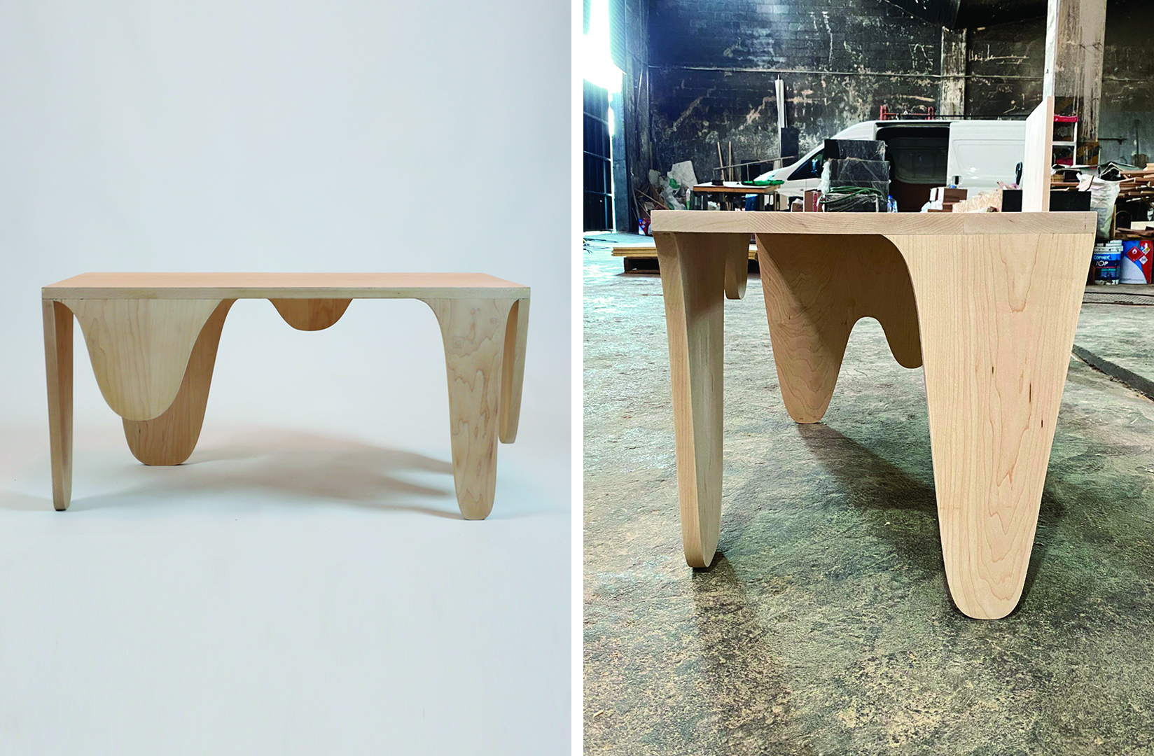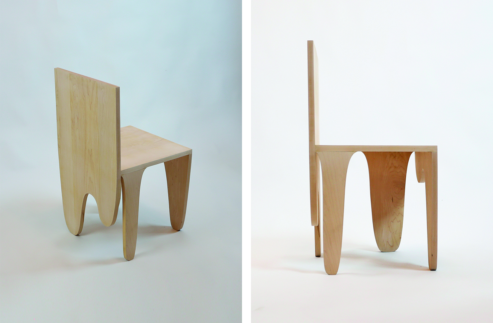 Pieza compuesta por dos muebles-objeto contradictorios en su realidad material. La plasticidad que nos transmite su diseño genera en el espectador una sensación de movimiento con constante en contraposición a su naturaleza estática. Las formas orgánicas dialogan con las diferentes alturas de sus soportes, que van cambiando según su posición, creando así diversas apariencias de una misma pieza. La sinuosidad de sus extremidades talla la madera de maple americano y nos transporta visualmente a una nueva materialidad no correspondiente con la original, una que es fluida, maleable y efímera. Se consiguen así objetos flexibles cuyas aplicaciones, no preestablecidas, pueden variar y adaptarse al usuario y a su entorno a lo largo del tiempo y en función de sus necesidades. – Blanca Arcos.