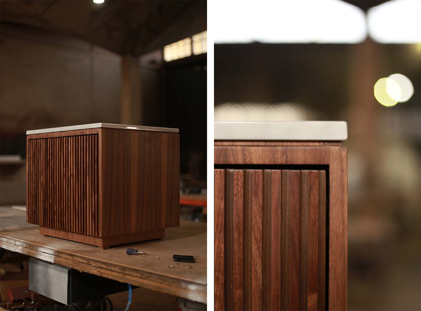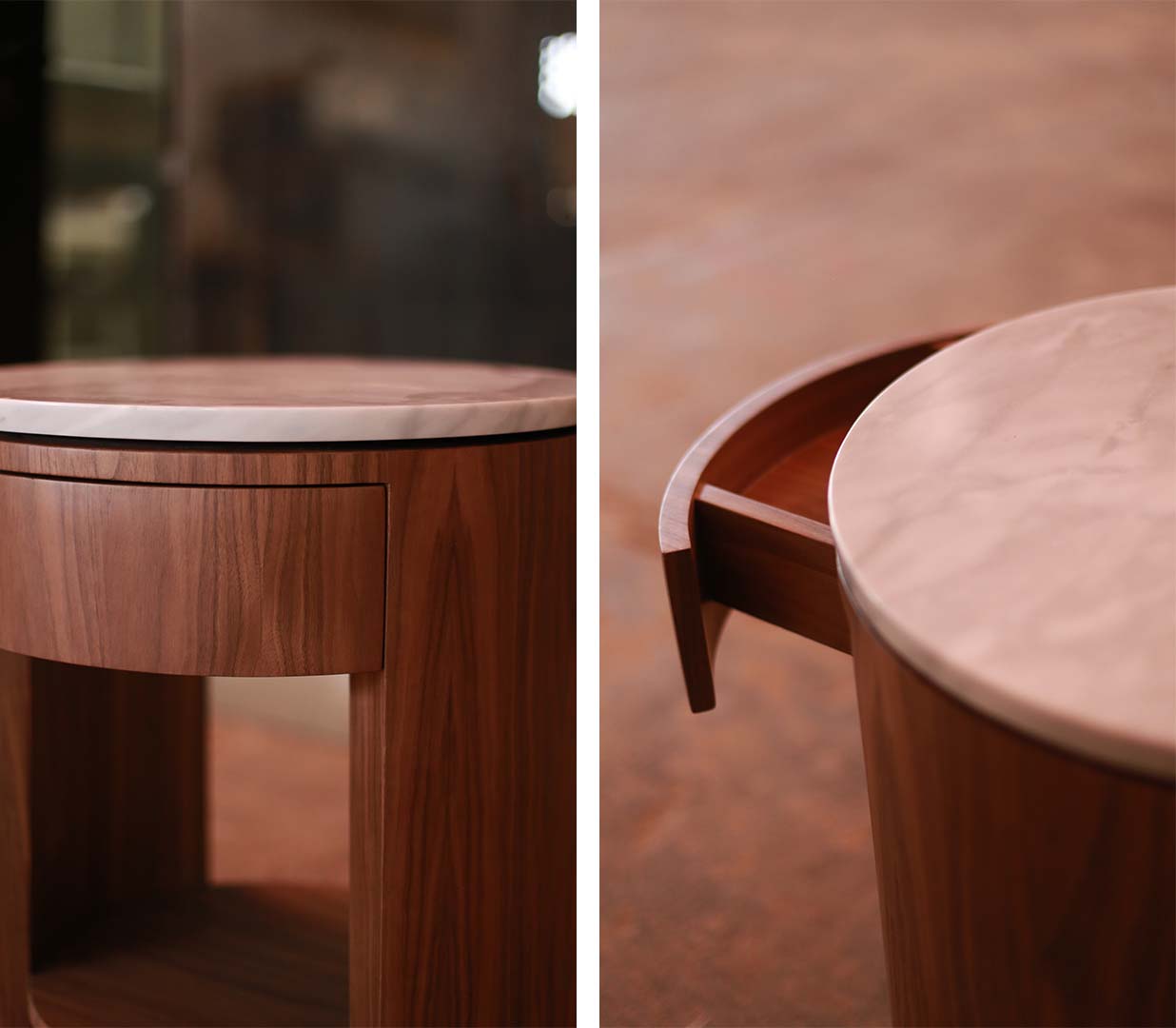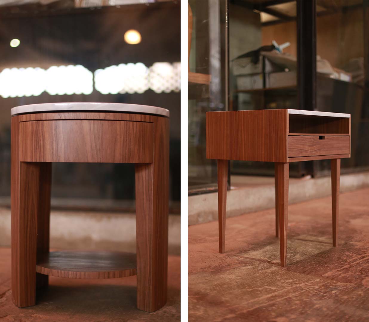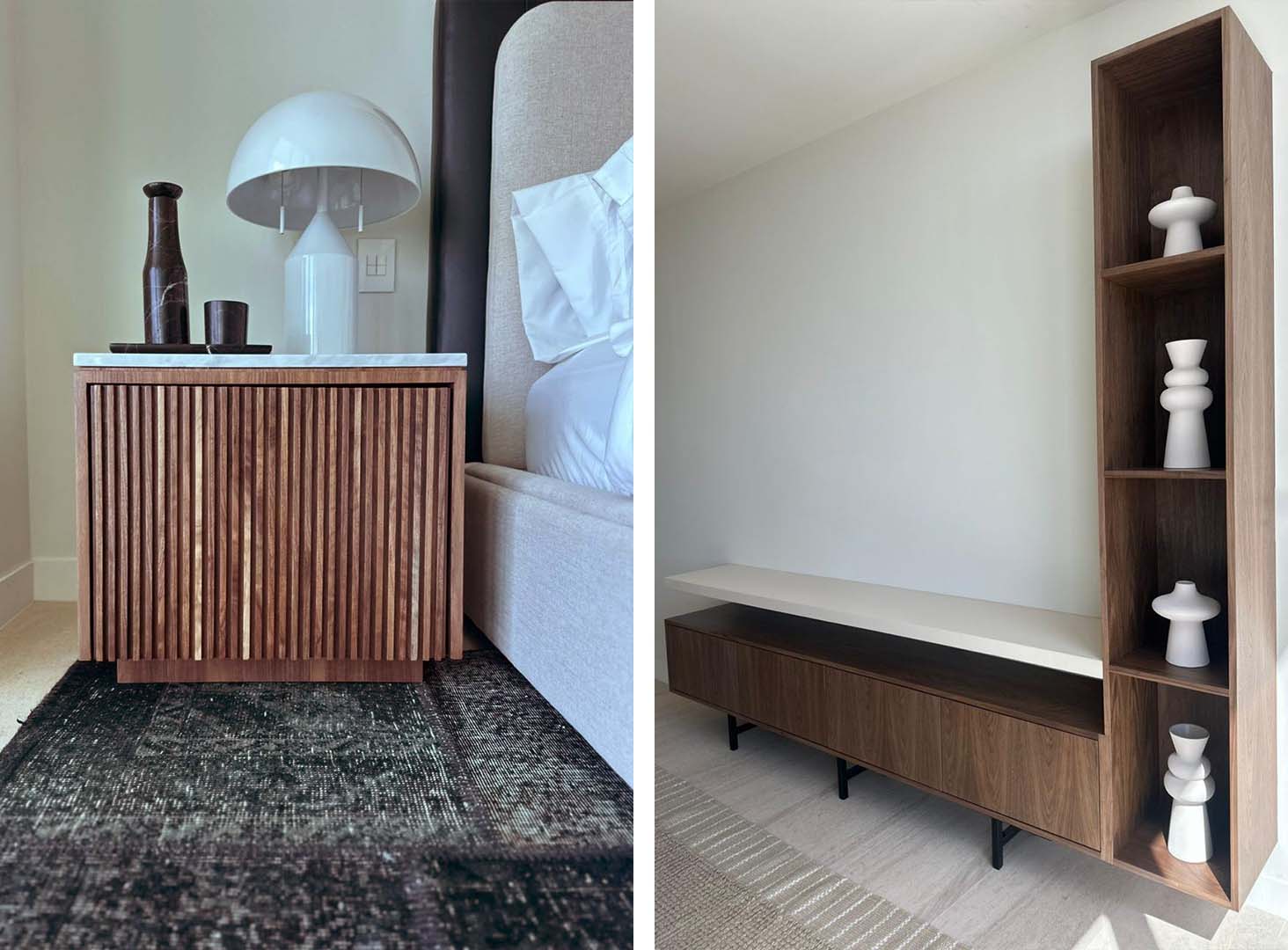 El proyecto es un departamento ubicado en Puerto Cancún, para el cual desarrollamos varios elementos del mobiliario utilizado por el equipo de Ale de la Isla para el interiorismo del espacio habitacional. El material principal fue el nogal, alguno de ellos en su color natural, otros tienen acentos de mármol blanco para sus superficies, mientras que otros son completamente blancos.