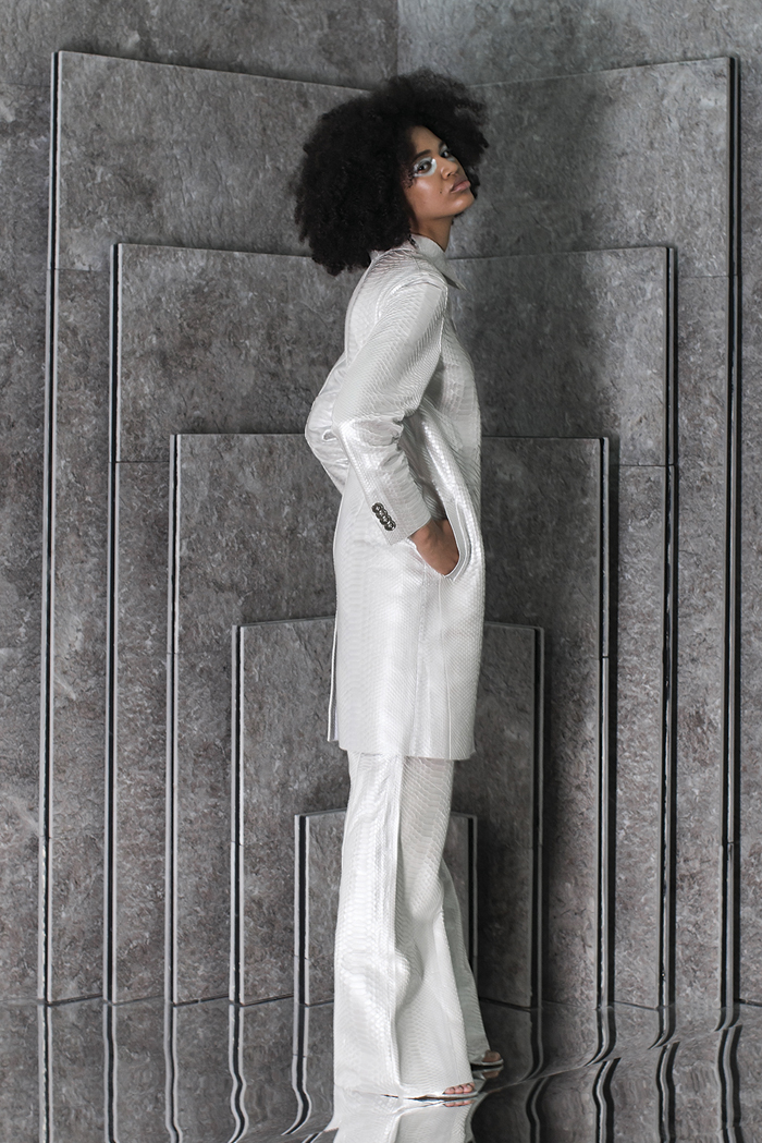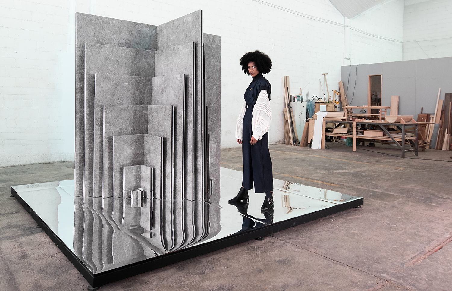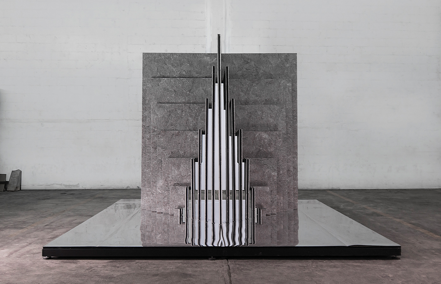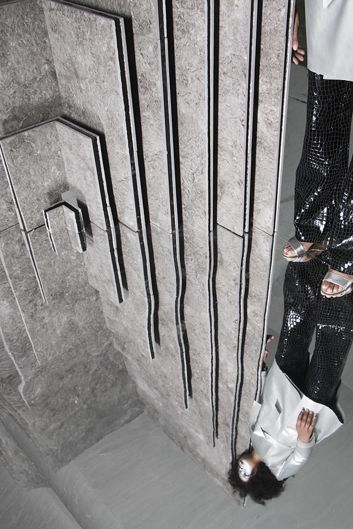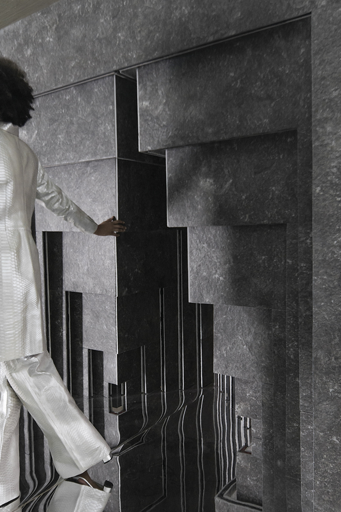 Al respecto, Jimena comenta: “Desde donde te pares, la pieza cambia. Está inspirada en la obra artística de Escher, quien jugaba con la perspectiva y en distintos planos mentales, hacía que el espectador dudara de la realidad creada por la mirada. El concepto de la pieza es de solidez y eternidad, quisimos crear una piedra que emergiera del espejo; de una realidad subalterna, pero de naturaleza sólida, a pesar de los muchos vacíos de la pieza creados intencionalmente con el fin de emular la realidad humana: realidad trastocada dependiendo del momento y del “ángulo” con el que se mire y se viva”. La instalación consiste en una pieza que en planta tiene forma de L, se va repartiendo y agrandando en simetría, hasta formar una gran T, en conjunto las piezas aprovechan el formato de los porcelánicos que apenas supera el diseño con una creatividad enorme, sumamente agradable a la vista y que resalta muy bien las cualidades de nuestro material”, explicó Karla Ibarra, gerente de marca Firenze.